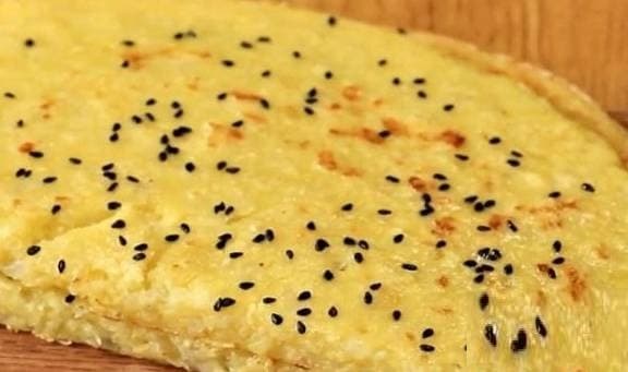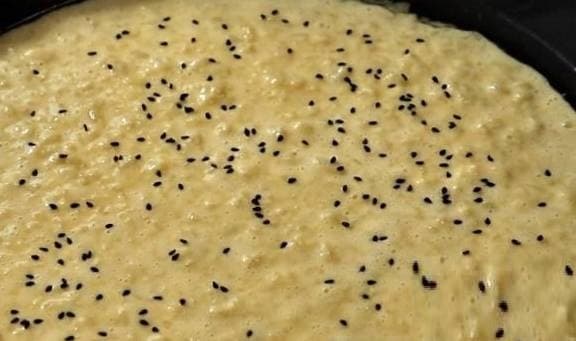 Bước 3: Quét dầu lên chảo nướng điện, cho hỗn hợp bột vào, dùng thìa dàn phẳng, rắc một lớp mè đen lên trên, đậy vung trong khoảng 3 phút, lật mặt còn lại nướng trong 3 phút nữa, sau đó cho ra đĩa và thưởng thức.